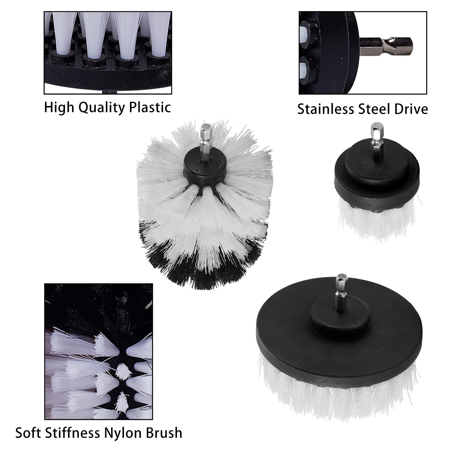 Set includes Three Different Size, Replaceable, Soft White Scrubber Brushes. The soft bristle nylon brushes will not scratch and can also be used on motorcycles, boats, jet skis, ATVs, Clean floor mats, carpets, and footwells. All brushes use the quarter inch quick change connection for the rapid changing of components.